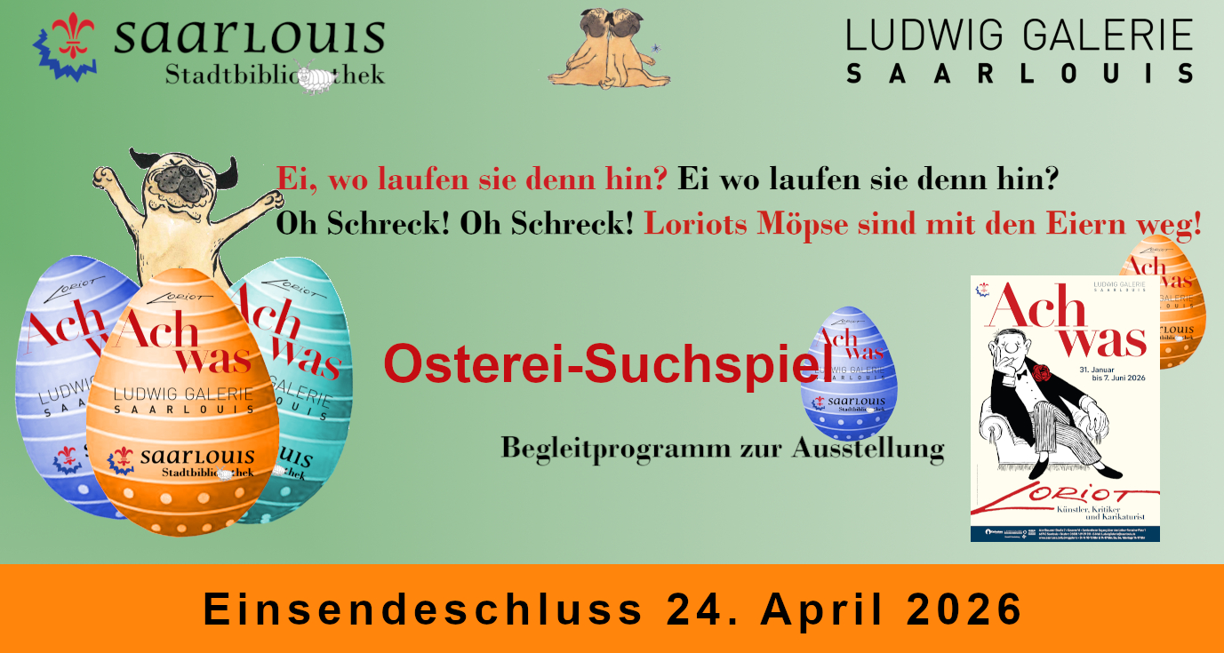 Vielleicht wollten sie nur dem Osterhasen beim Verstecken der Eier helfen. Aber das Ergebnis ist das gleiche. In der Ludwig-Galerie Saarlouis und der Stadtbibliothek Saarlouis fehlen Ostereier. Und die Verantwortlichen fragen sich: „Ei, wo sind sie denn hingelaufen? Ei, wo sind denn die Möpse mit den Eiern hin?“ Nun braucht die Ludwig Galerie Saarlouis und die Stadtbibliothek Saarlouis Hilfe bei der Suche nach den Eiern. Als Anreiz dafür haben die Bibliothek und die Galerie ein Suchspiel gestartet. Jeder kann helfen, indem er sucht und die Anzahl der gemopsten Eier den beiden Kulturinstitutionen der Europastadt Saarlouis mitteilt. Teilnahmescheine mit den Teilnahmebedingungen bekommt man dort vor Ort.
